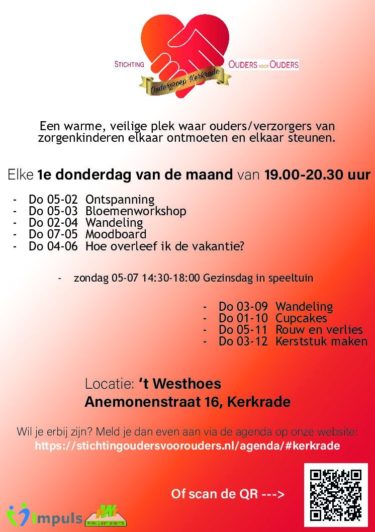 Onder leiding van Shirley Bertram en Mandy Derissen en met ondersteuning van Janine Dassen (Impuls Kerkrade) en Suzy Kuypers, komen ouders elke 1e donderdag van de maand samen om ervaringen te delen en steun te vinden.